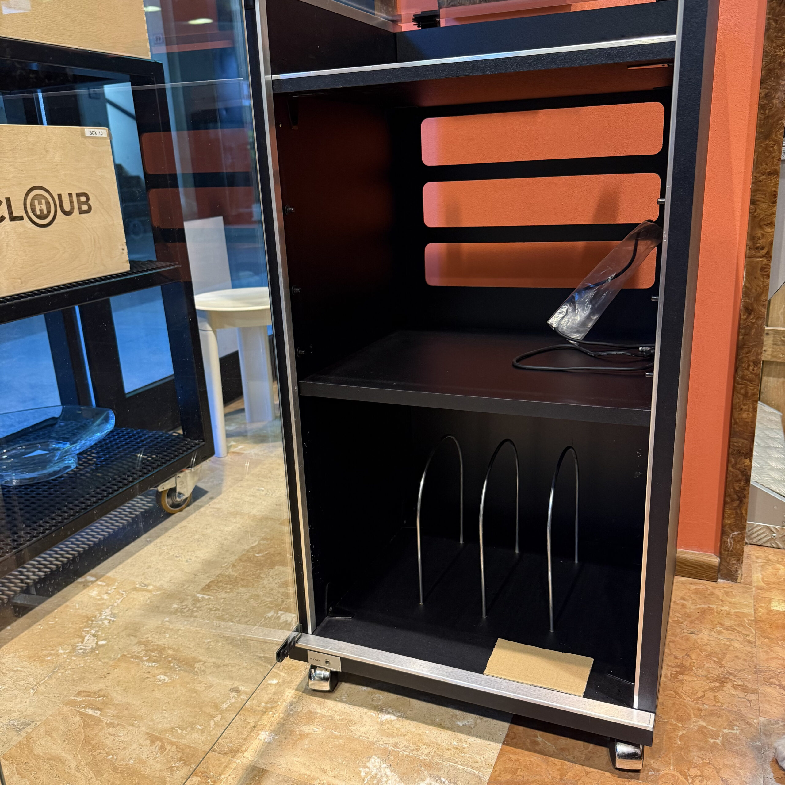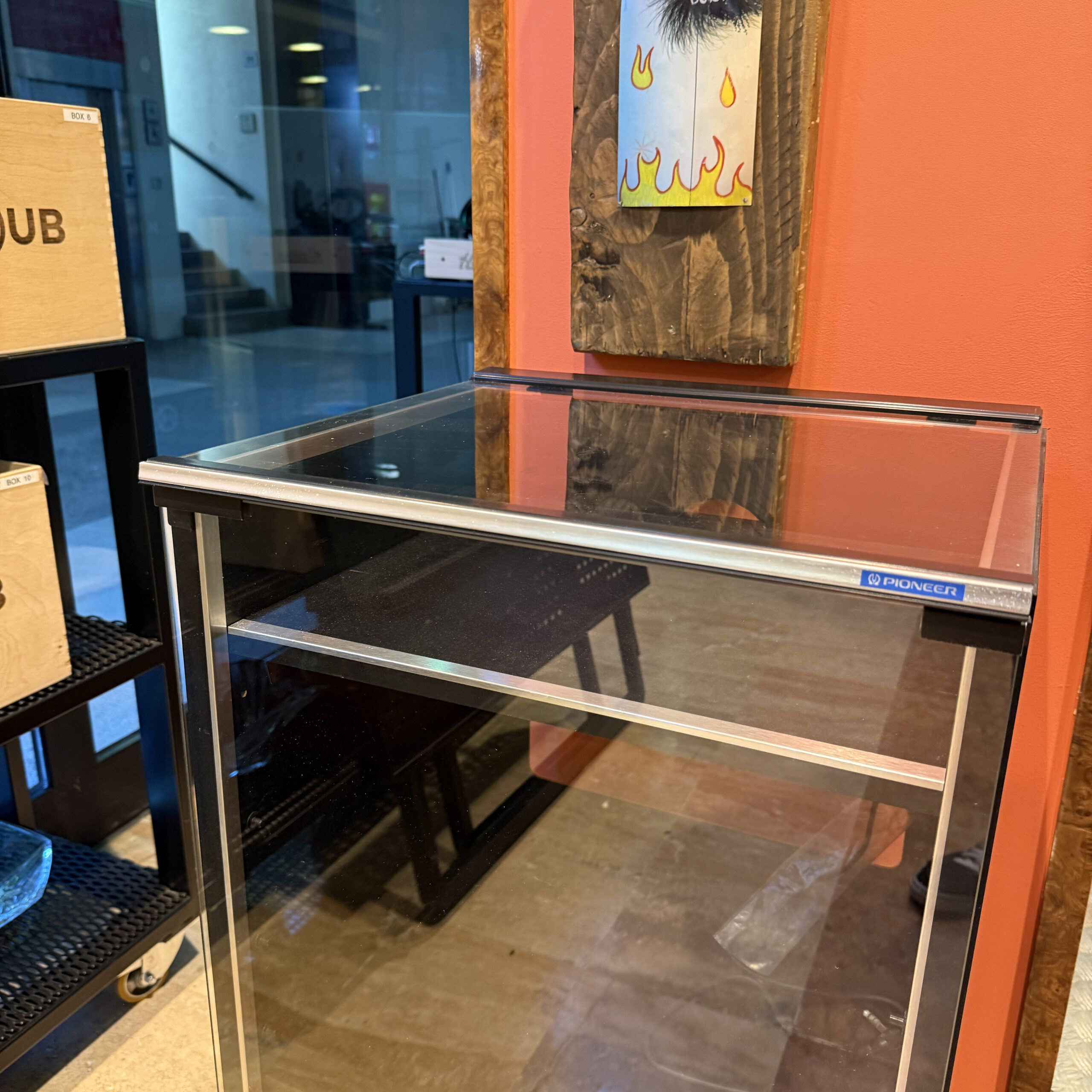 Mobiletto a Rack anni 80 della famosa casa produttrice Pioneer Può per contenere un giradischi, fino a 3 rack come EQ, Synth ecc ed è dotato di un ampio scompartimento con divisorie per i vinili
